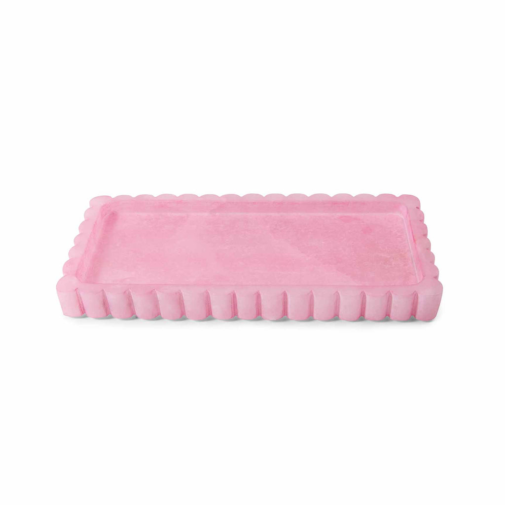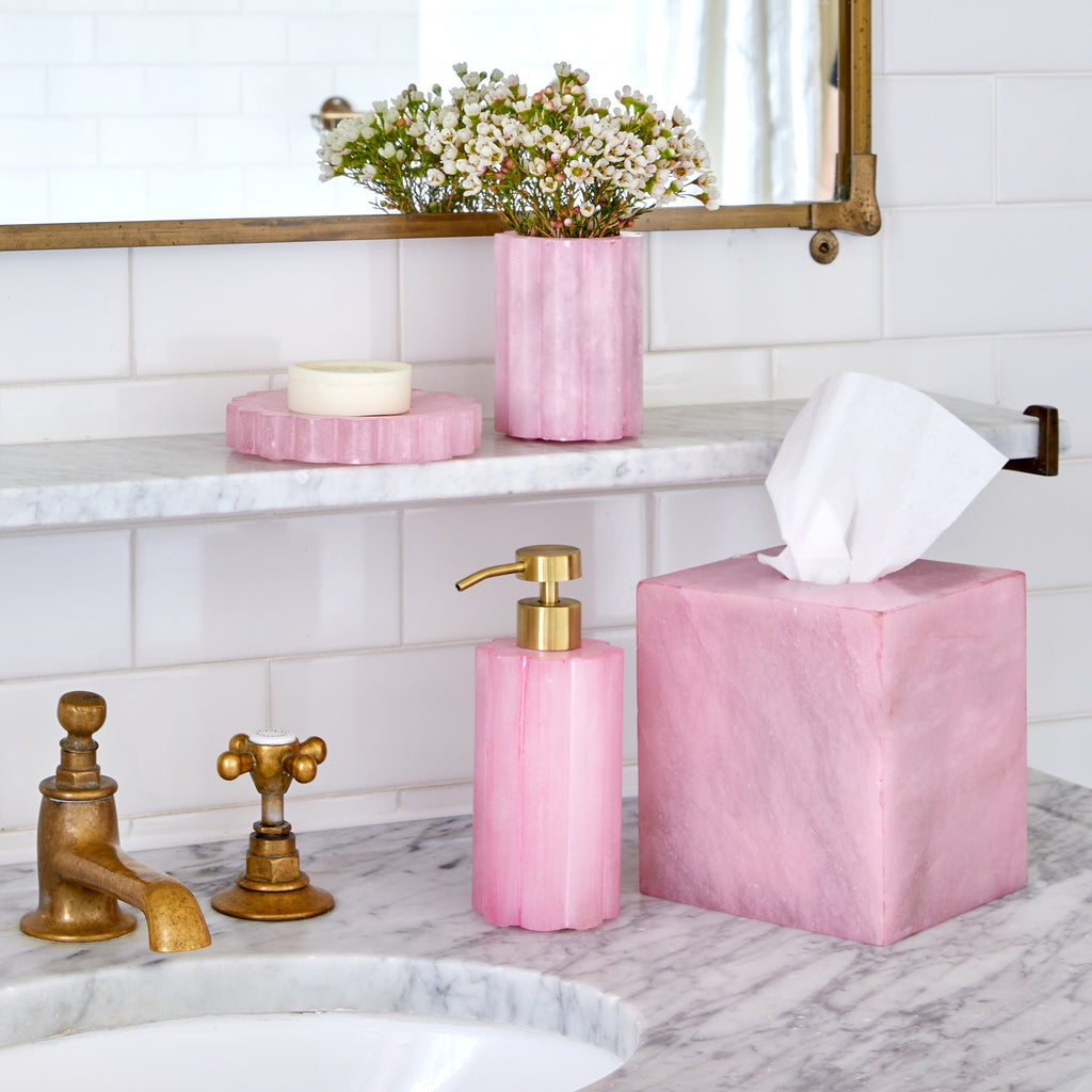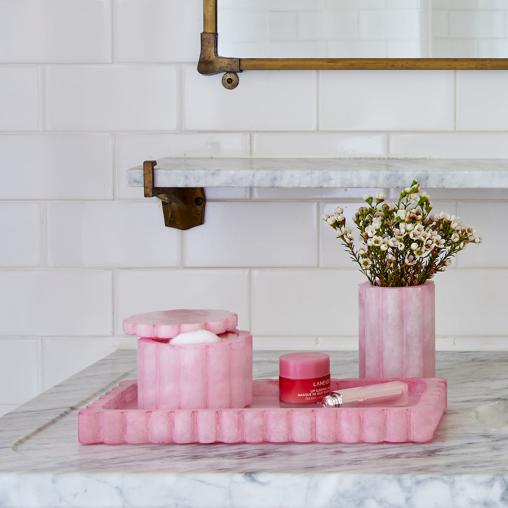 Brighten up your daily routine with our Wavy Bath Accessories. The ultimate Get Ready With Me essential, this accessory set is made from dyed-pink alabaster and features scalloped details for a trendy-meets-traditional look inspired by vibrant 90s colorways and Danish Scandi style pastels.