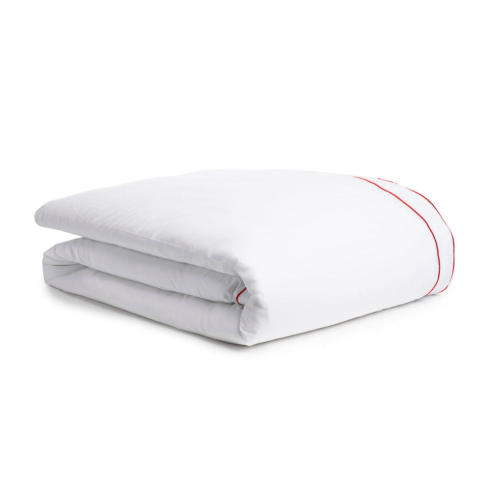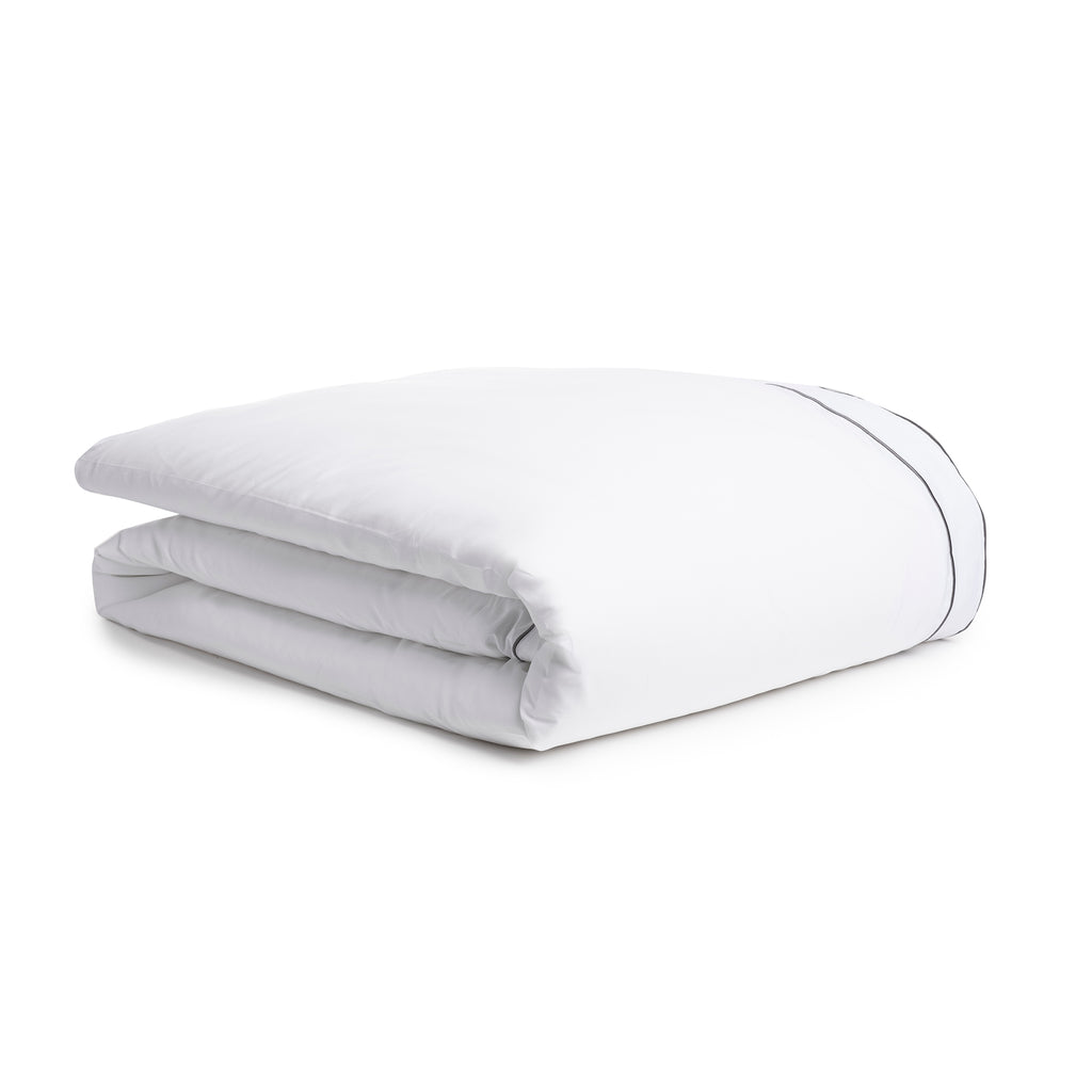 The Salerno Duvet features percale fabric made with a proprietary blend of eucalyptus and long-staple cotton, updated with a sophisticated piping detail.