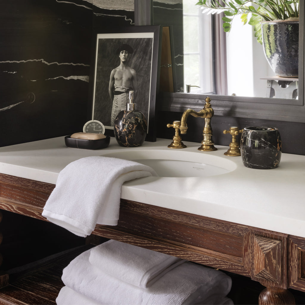 Create an upscale spa oasis at home with our bold and distinctive, Athenas Bath Accessories. Masterfully crafted from Athena black flower marble, this accessory set adds exquisite appeal with its natural veining in rich shades of brown and classic white that artfully resemble floral forms and petals, providing the perfect contrast against the striking black marble. This collection also incorporates accessories in varying round and angular shapes for a unique, yet cohesive look. Not dishwasher safe.