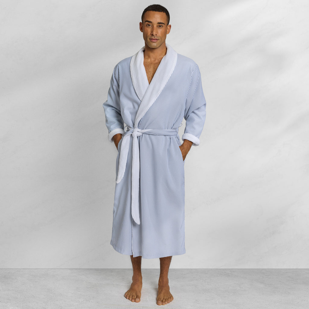 Lounge in style with our Classic Seersucker Striped Robe. Featuring a modern, seersucker stripe and plush fleece lining, this robe is as stylish as it is comforting. Includes hidden side pockets.