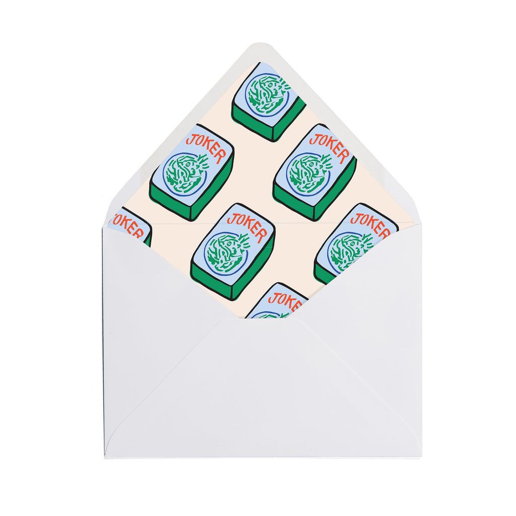 Calling all Mahjong lovers! Dear Annabelle's new Limited Edition Pray for Jokers Notecard Set celebrates the highly social, exquisitely beautiful, curiously satisfying traditional Chinese game that has stolen so many of our hearts. Featuring an adorable illustration of the joker tile, these notecards are perfect for game night invites or notes to friends who play, and the whole set makes an amazing gift to fellow enthusiasts. Printed on luxe, smooth-finish paper with a combination of engraving and flat printing. Keep calm and Mahjong!