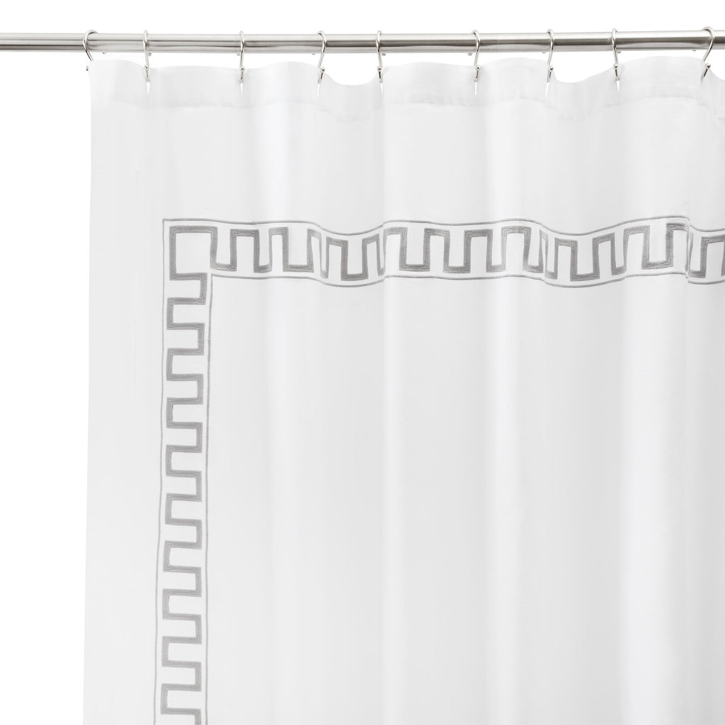 This shower curtain showcases the enduring appeal of the classic Greek key pattern. Its graphic yet timeless design brings a refined freshness to any bathroom. Crafted from cotton twill, the fabric offers a subtle diagonal rib texture, while the embroidered Greek key border enhances its sophisticated look. The top of the curtain features 12 reinforced openings for shower rings, combining practicality with elegant style. Shower curtain rings sold separately.