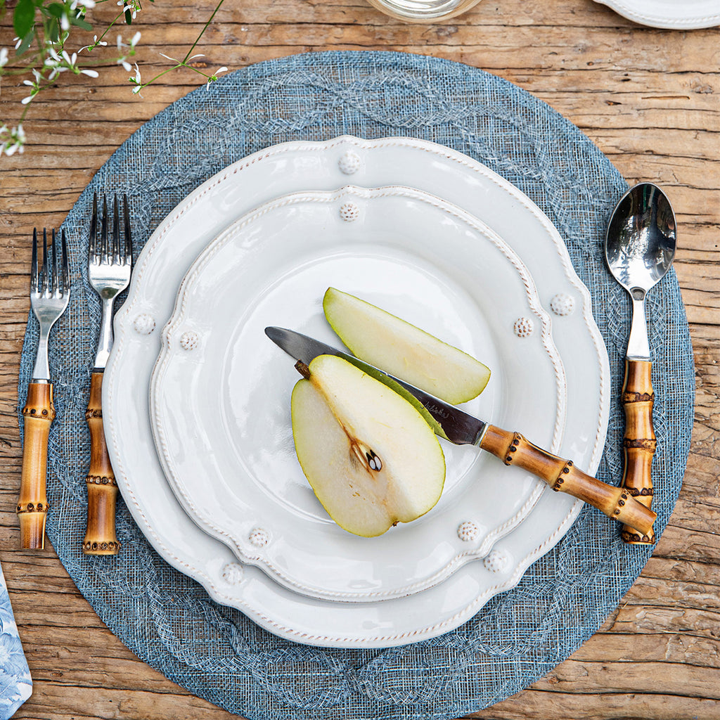 Set a chic, yet casual table setting with this 5-piece Bamboo flatware set by Juliska. Each utensil features a natural bamboo handle with 18/10 stainless steel. Includes: one salad fork, dinner fork, dinner spoon, teaspoon, and knife.