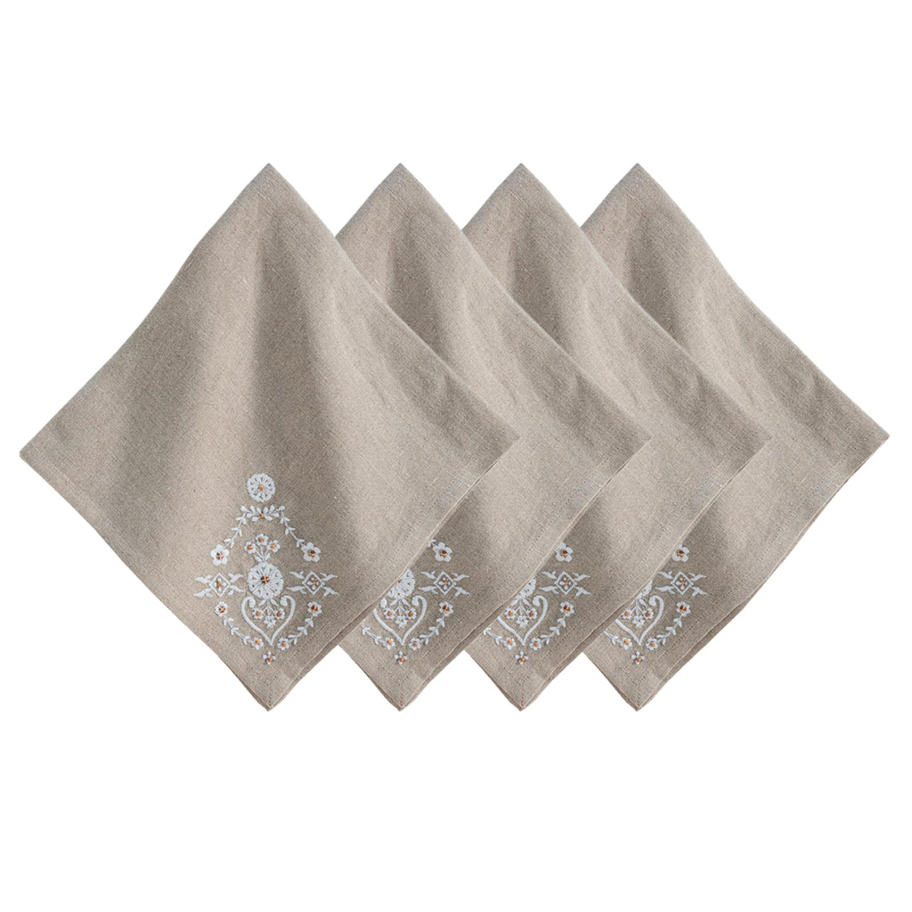Create a stunning tablescape with these Heidi Napkins by Juliska. Adorned with detailed embroidery in a stunning intricate floral motif, these napkins are evocative of inherited heirlooms, adding instant elegance to any occasion. Made from high-quality linen with woven cotton, they are perfect for both holiday table settings and everyday use. Sold as a set of 4.