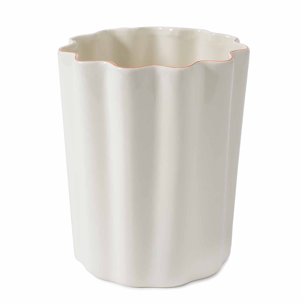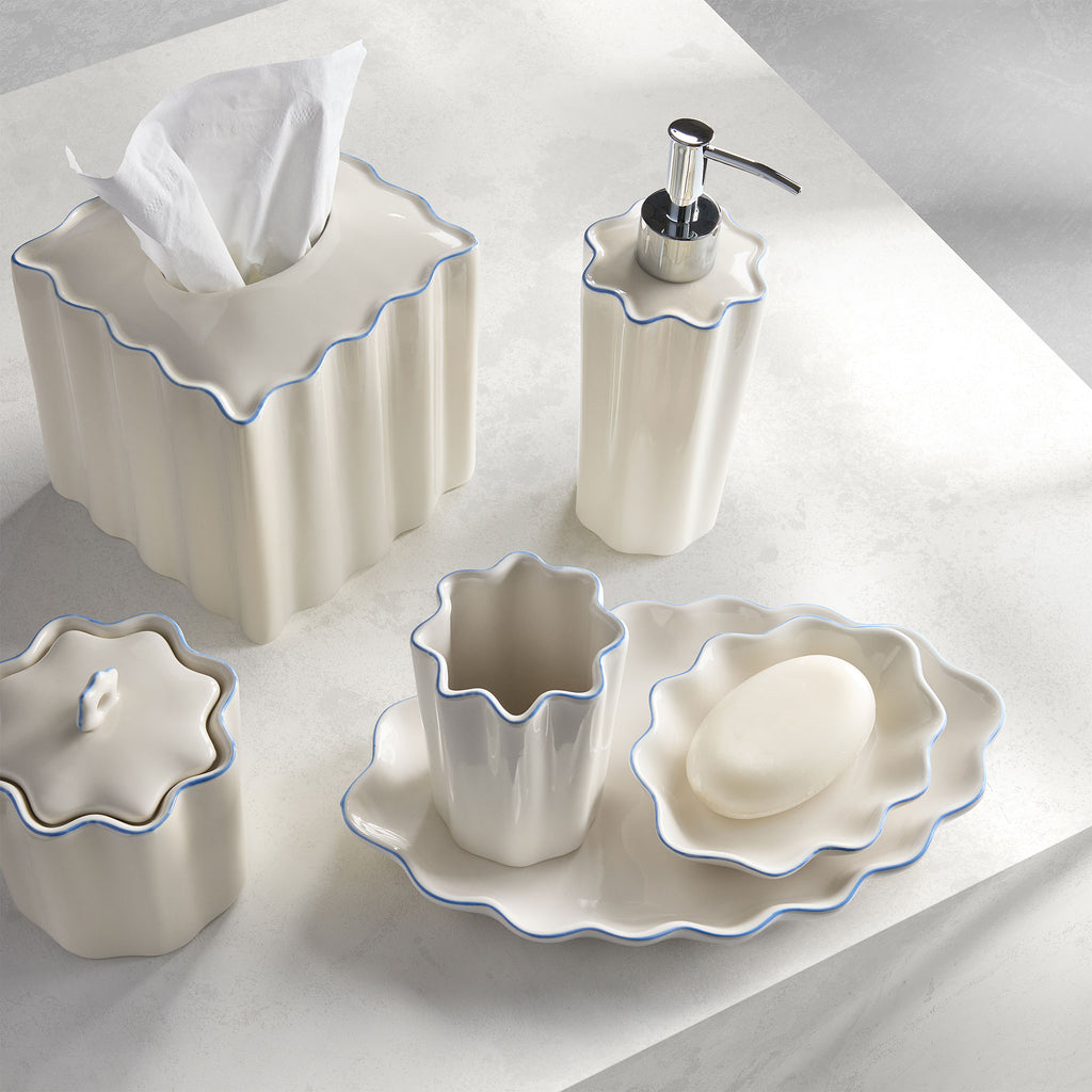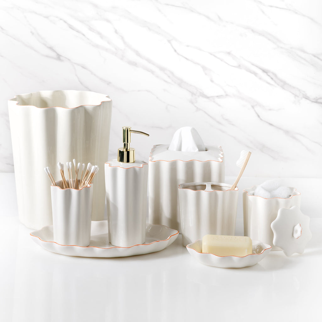 Crafted from cream-colored porcelain and featuring a whimsical scalloped design, the Le Marais collection is an elegant addition to any bath. Along the top of each collection piece is a subtle-trim detailing that further accentuates the scallop shape of this timeless accessory set.