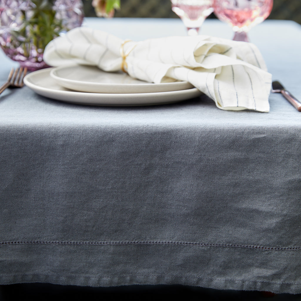 A beautifully decorated table starts with a classic linen tablecloth. Ours is made of 100% linen in Portugal and features a hemstitched detail along the border. Measures 70” wide by 96” long.