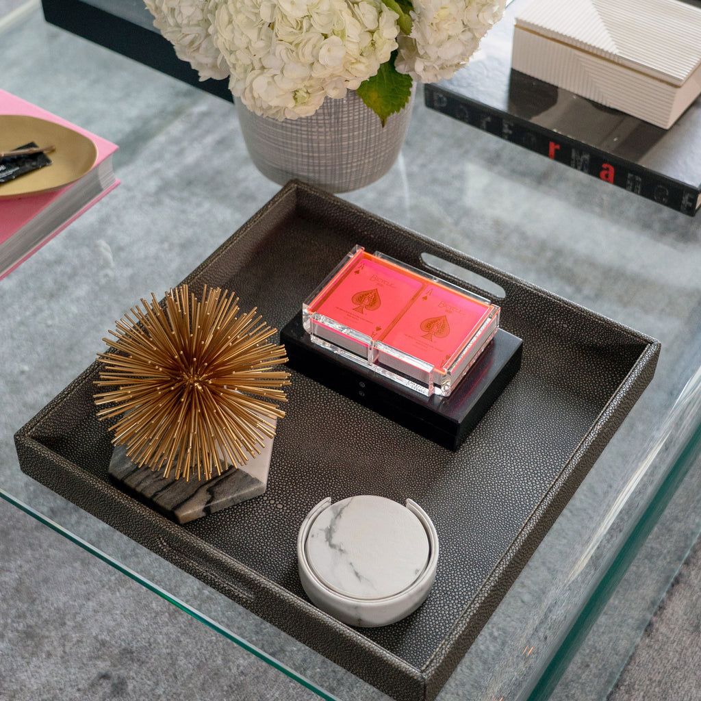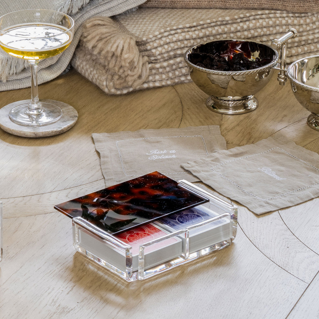 Try your luck with this ever-chic playing card set. A fun take on a classic, this double-deck card set includes a vibrant lucite case.