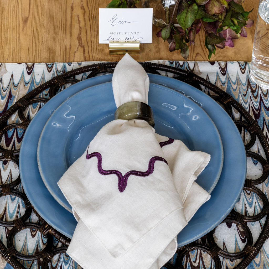 From casual family dinners to festive formal gatherings, set the table in style with our Ripple Embroidered Napkins. Offered in a classic shade of ivory and featuring our signature ripple embroidery in a rich plum hue, each napkin captures the feeling of playful sophistication and understated charm. Embroidery is featured on one side. Sold as a set of 4.