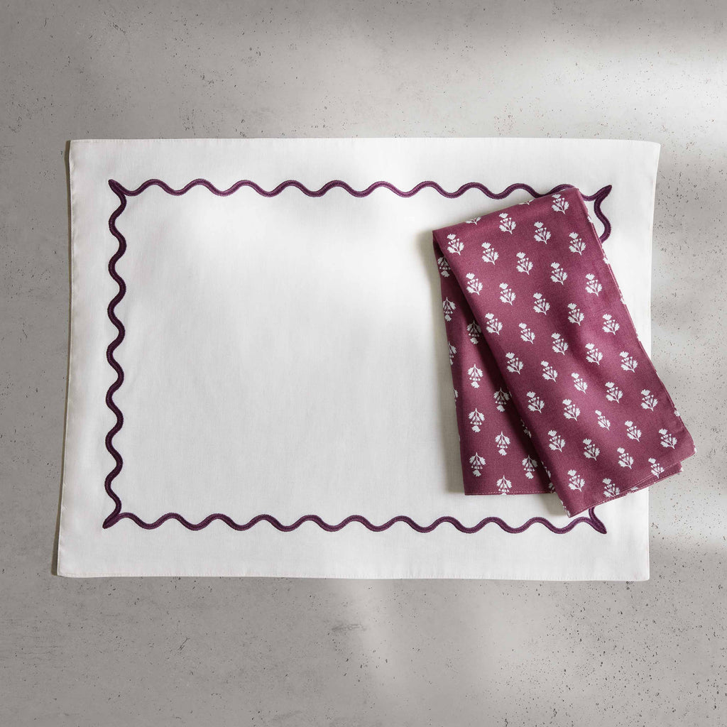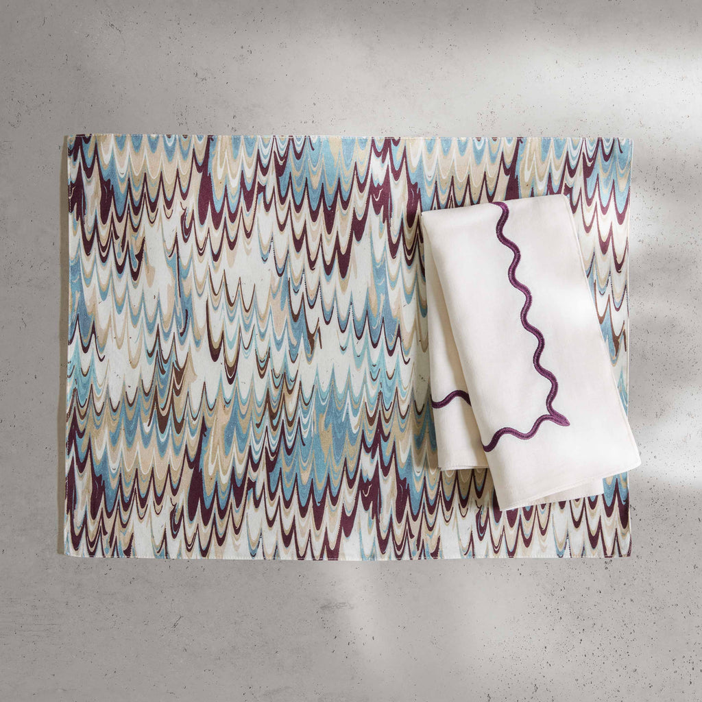 From casual family dinners to formal gatherings, our Ripple / Fluted Marble Reversible Placemats transform every meal into a memorable occasion. Crafted for versatility, one side showcases our classic ripple embroidery while the other features patterns inspired by traditional marble paper. The combination of blue, beige, and plum hues adds a contemporary touch that perfectly marries timeless design with a modern appeal. Sold as a set of 4.