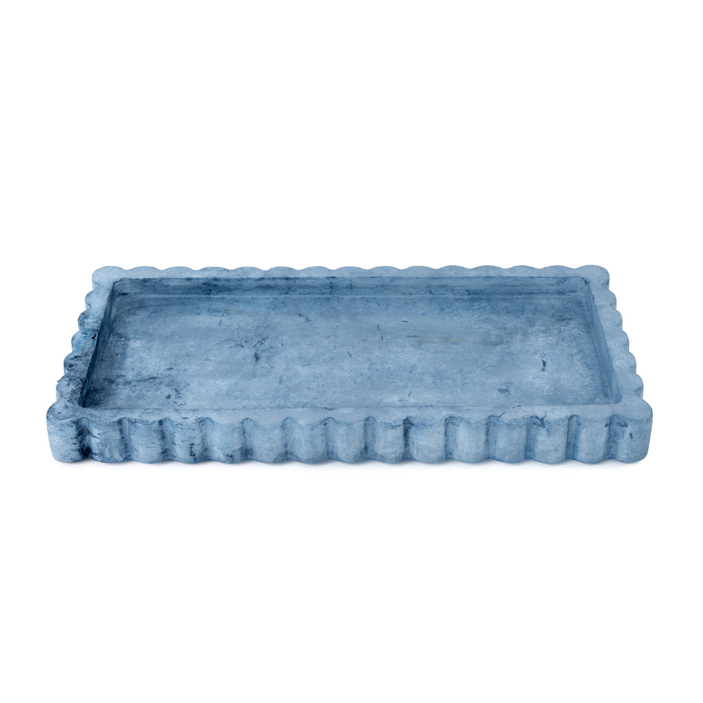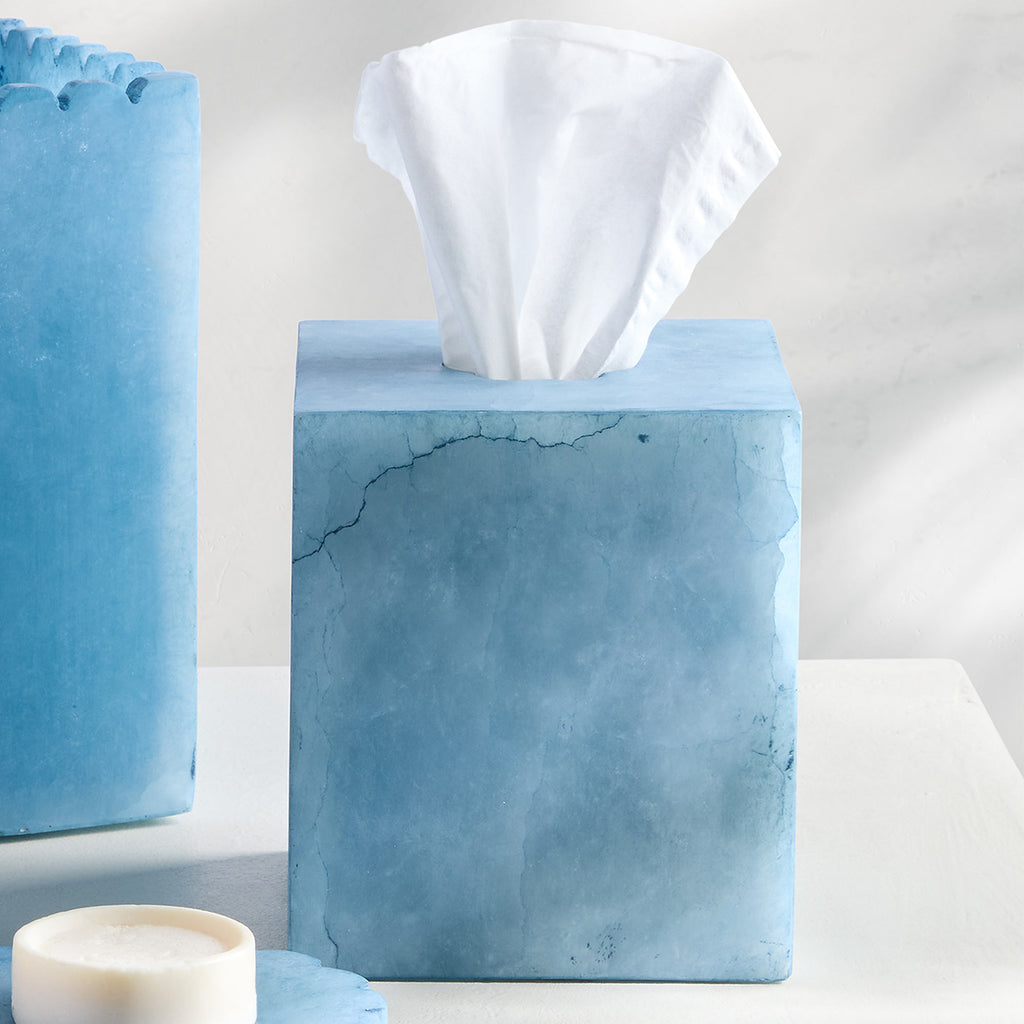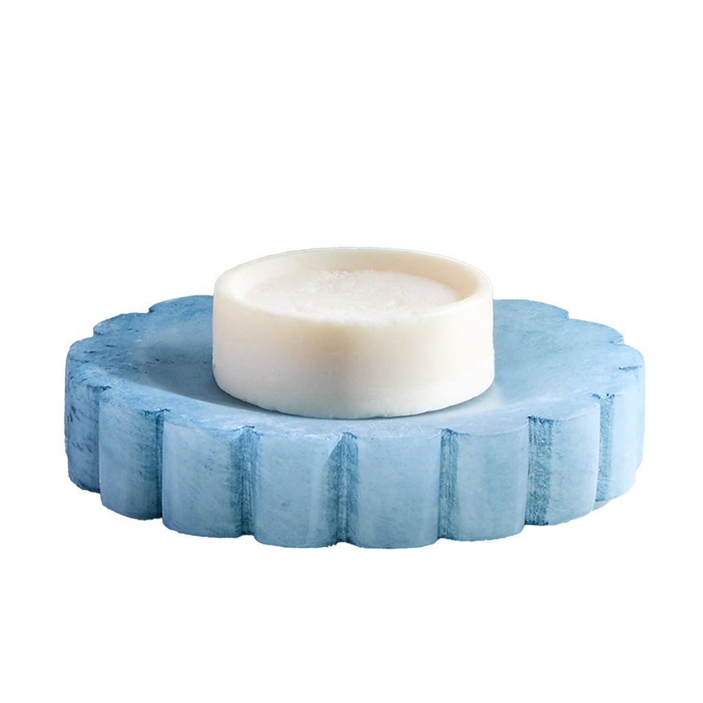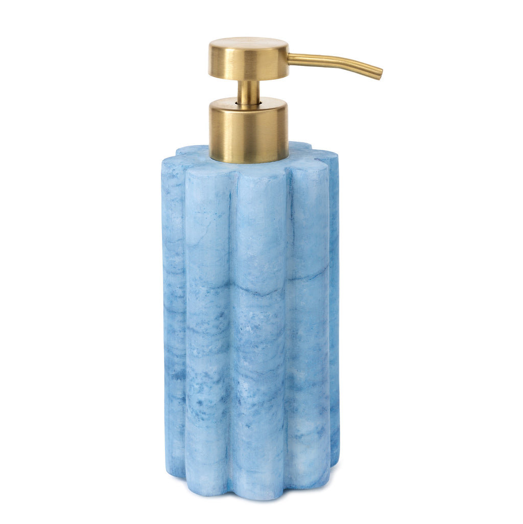 Brighten up your daily routine with our Wavy Bath Accessories. The ultimate Get Ready With Me essential, this accessory set is made from dyed-alabaster in your choice of vibrant pink or icy blue and features scalloped details for a trendy-meets-traditional look inspired by vibrant 90s vibes and Danish Scandi style. The lotion dispenser features a brass-colored top pump for touch of sophistication. Not dishwasher safe.