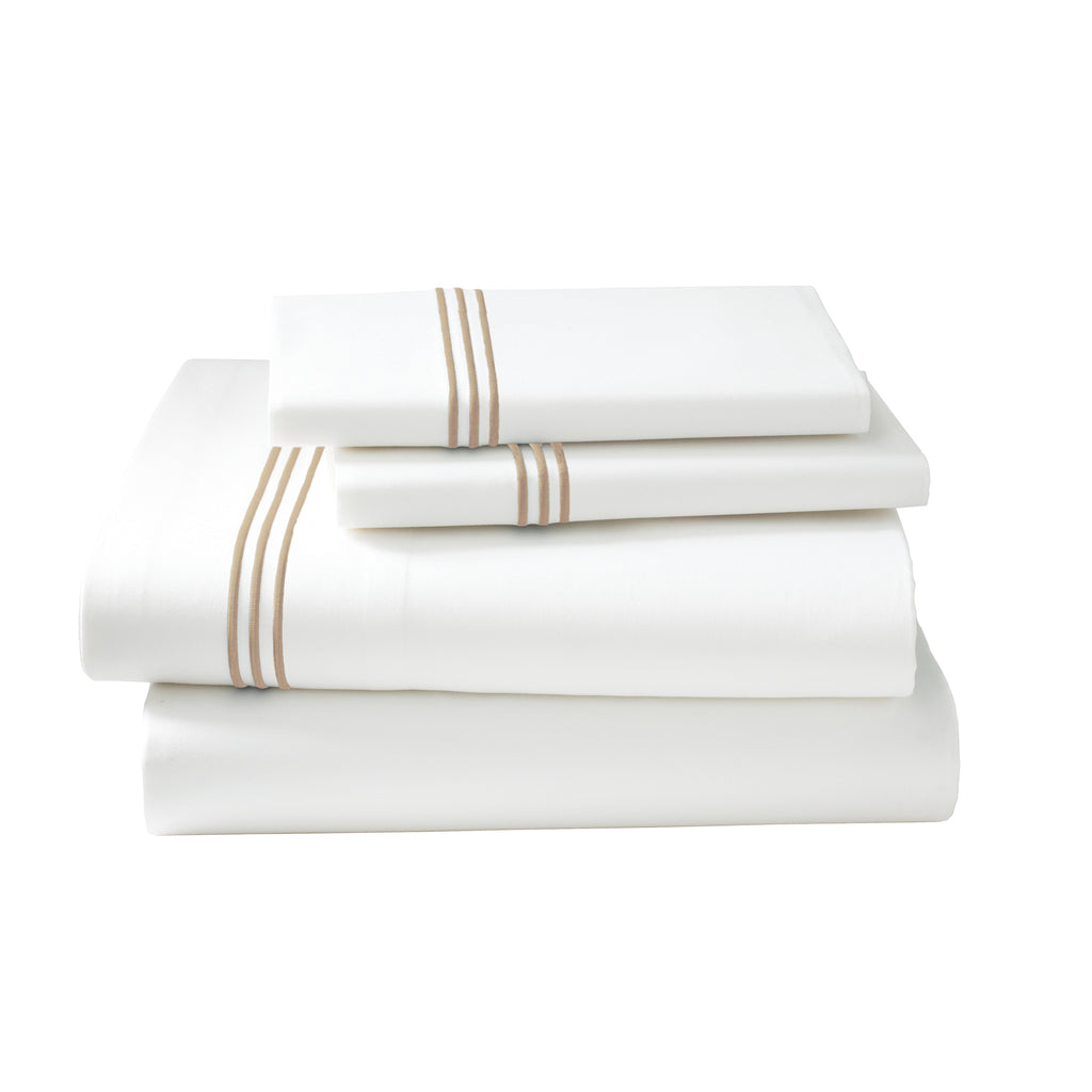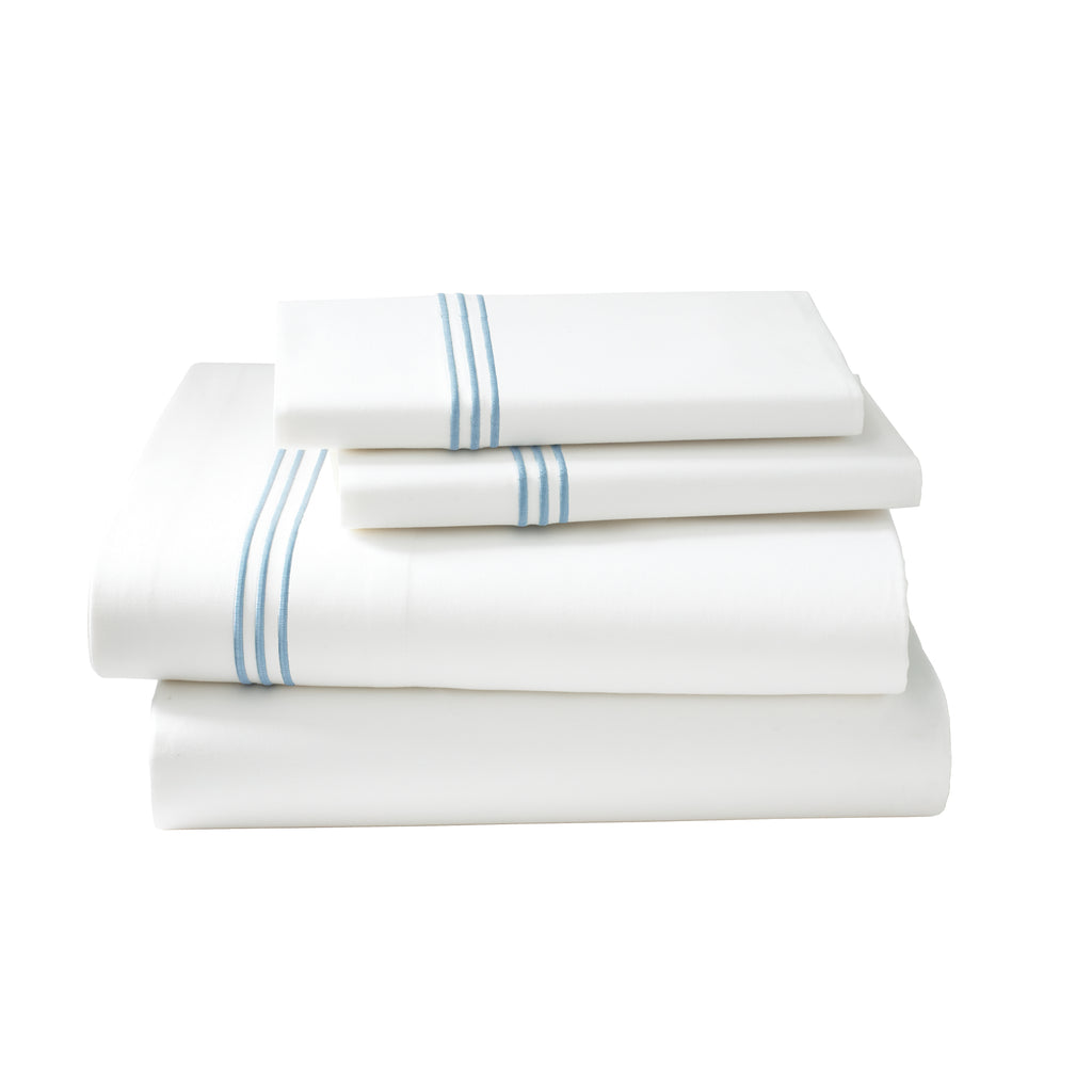 Our best selling percale sheets, made with a proprietary blend of eucalyptus and long staple cotton, get a style update with sleek three stripe embroidery.