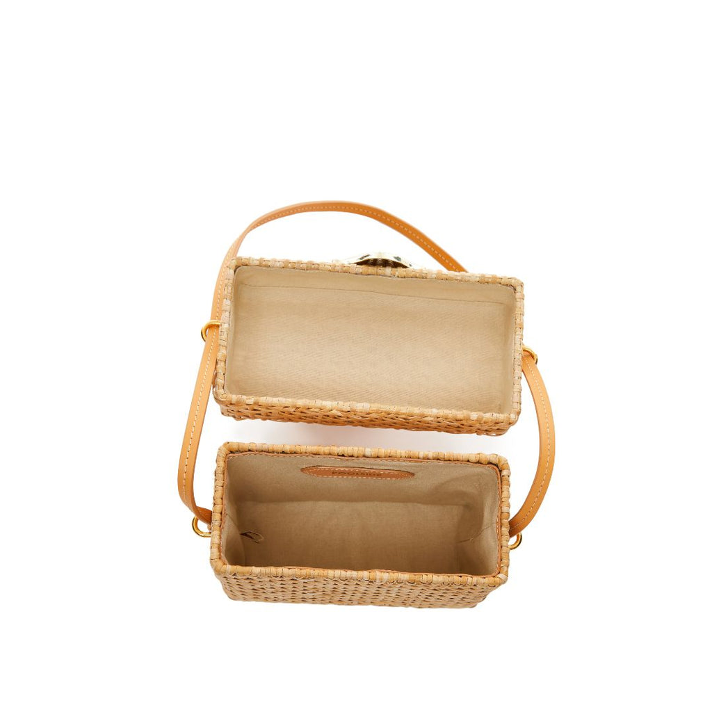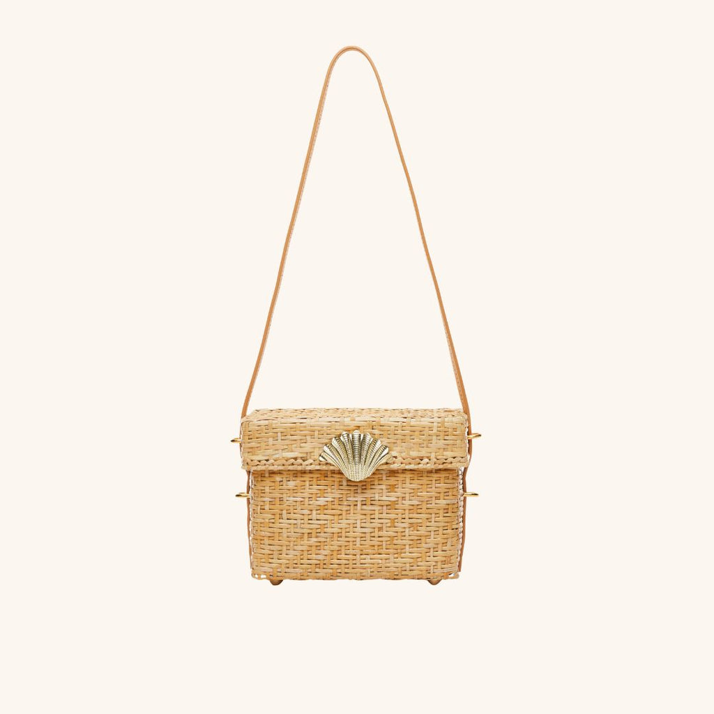 The POOLSIDE vintage-inspired box bag features a custom designed 18K gold plated shell embellishment. Wear this day or night.