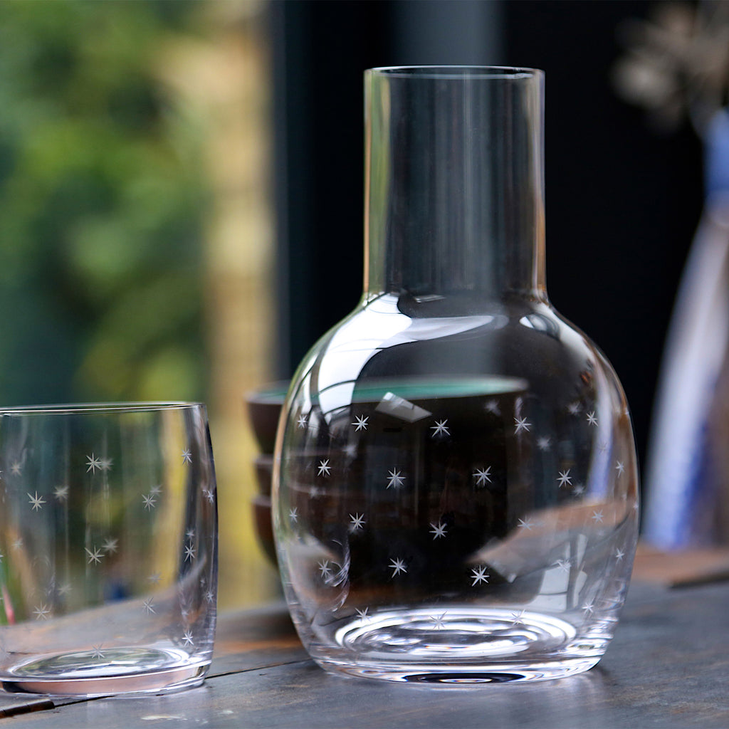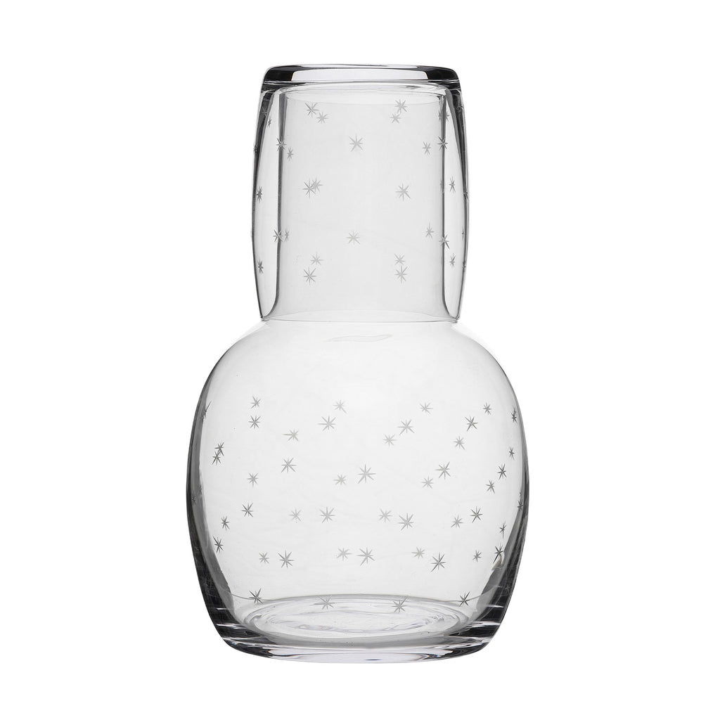 Make your house guests feel warmly welcomed with this sophisticated Carafe and Glass Set by The Vintage List, arranged by the bedside. Featuring a timeless design and hand-engraved stars, the stylishly shaped carafe holds a capacity of 44oz and includes a glass cup designed to fit atop the carafe, serving as a lid. This set is dishwasher safe.