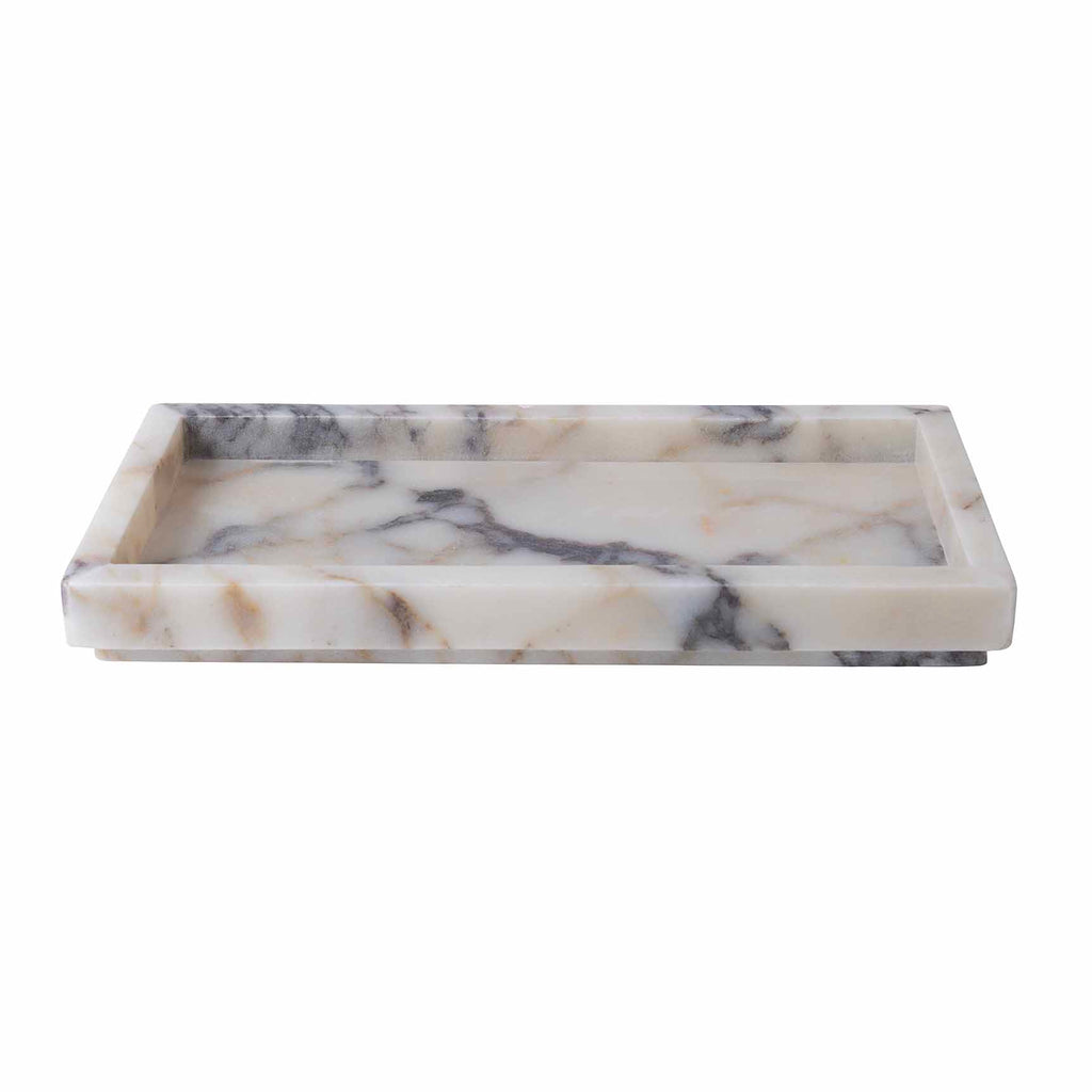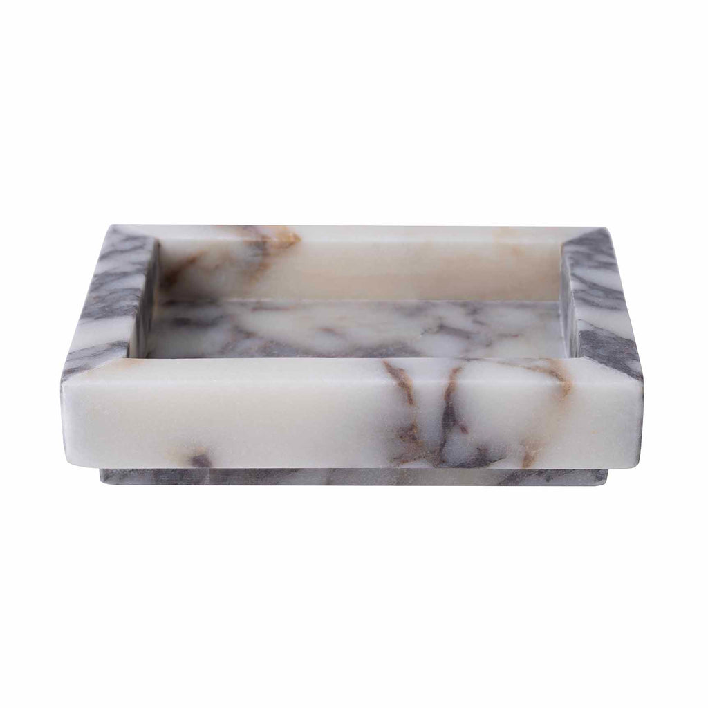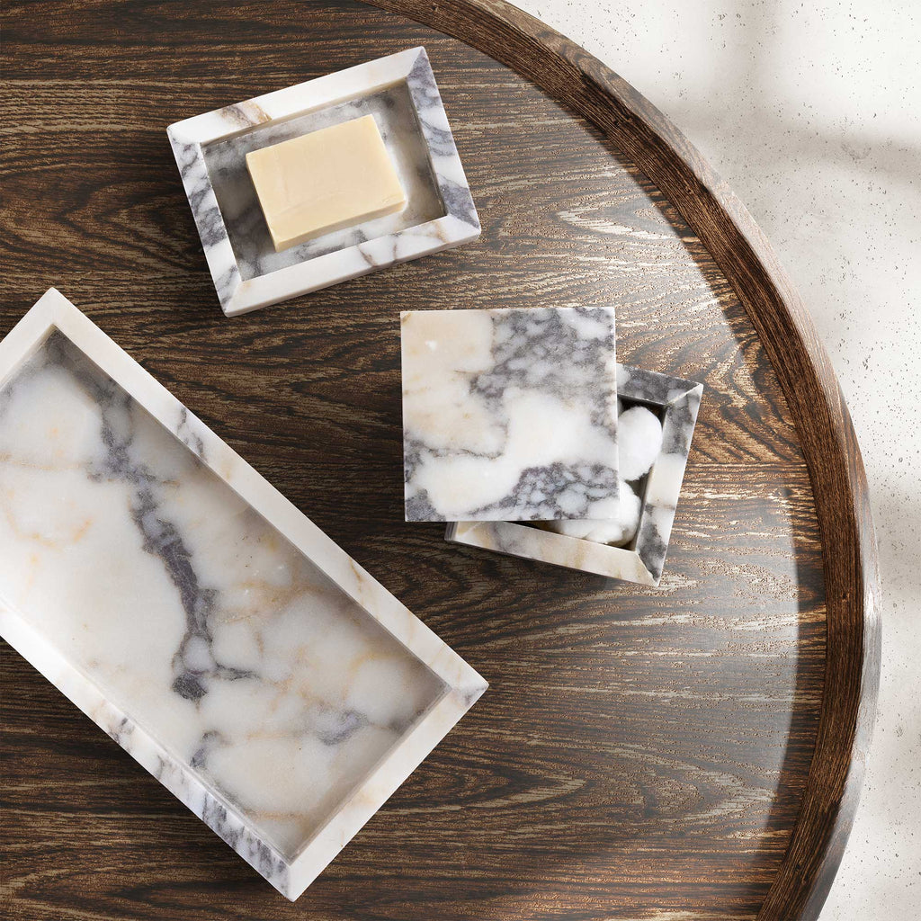 Drawing inspiration from the chiseled Greco-Roman sculptures decorating cities from Florence to Puglia, the Viola Collection, made from bianca viola marble, is simplicity redefined with its natural veining featuring sandy tones and hues of grey. This collection adds a touch of ancient spa to any space. Each accessory also features a small beveled platform, adding to this set's captivating appeal. Not dishwasher safe.